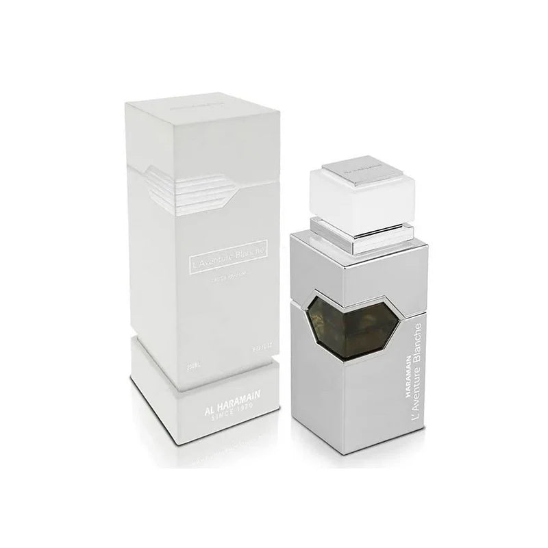 Al Haramain L'Aventure Blanche: Inspirado en Creed Silver Mountain Water, este perfume combina una salida cítrica refrescante con notas florales blancas y un fondo amaderado. Una fragancia vibrante y sofisticada que transmite lujo y confianza.